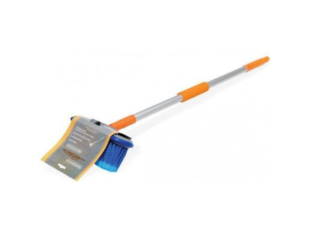 Швабра с насадкой в виде щетки длиной 20 см и рукояткой 130 см поможет удалить с корпуса машины грязь и пыль. Ручка швабры имеет телескопический механизм, а также поролоновые вставки для более удобной эксплуатации. Длинный и мягкий ворс синей окраски плавно удалит загрязнения с поверхности автомобиля, не нанося повреждений лакокрасочному покрытию машины.