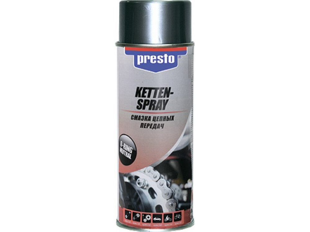 Смазка цепных передач Presto обладает уникальным составом, обеспечивающим длительный смазывающий эффект цепных передач в транспортных средствах и системах. Высоковязкая смазка специально предназначена для быстродвижущихся и высоконагруженных цепей (например, у кроссовых мотоциклов). Особый состав средства предотвращает стекание масла с цепи даже при высокой скорости движения.